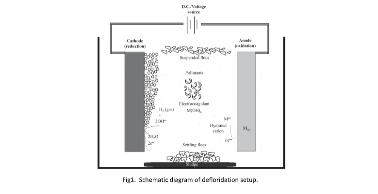Nature of drinking water is a major task in advanced days because of expansion in pollution of water bodies. Fluoride is one such pollutant that undermines living life forms, specifically people . Fluoride is an vital in little amount for mineralization of bone and assurance against dental caries, higher intake reasons decay of teeth enmel called fluorosis. Fluoride enters aqueous environment by weathering of fluoride rich minerals and as through anthropogenic actions, for example, industrial drains. The issue of fluoride in water bodies is serious for tropical nations, for example, such as India, Kenya, Senegal and Tanzania. The best way to pypass this issue is defluoridation. Various methods are accessible for the removal of fluoride from water, for example, precipitation-coagulation, membrane-based processes, ion –exchange and adsorption process. Lime and alum are the most usually utilized coagulants for Nalgonda technique for defluoridation of water. Expansion of lime prompts precipitation of fluoride as insoluble calcium fluoride and raises the pH value upto 11 – 12. Electrocoagulation is a technique for applying direct current to sacrificial electrodes that are submerged in an aqueous solution]. Electro-coagulation is a straightforward and efficient technique to remove the flocculating agent produced by electro- oxidation of a sacrificial anode and generally made of iron or aluminum. In this process, the treatment is performed without including any chemical coagulant or flocculants. In this way, diminishing the amount of sludge which must be disposed.