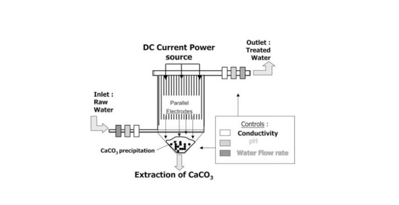scale formation is the use of anti-scalants to delay or prevent the mineral crystal nucleation, owing to the effects of chelation, dispersion, lattice distortion, and threshold. Unfortunately, there is a hidden defect of the above method that the hardness ions are not removed out from the water and also probably affect the process effi- ciency in the subsequent treatment units. Lime softening method is widely utilized for water softening based on the alkalizing effect; but this treatment process produces excess sludge and increases the saltness when finally using the acid reagents to neutralize the solution pH. Ion exchange shows relatively high efficiency in hardness removal, frequent and laborious chemical regeneration is required, which is environmentally unfriendly because of producing a large volume of spent solutions of acids or salts. Precipitation of CaCO3 by electrochemistry was originally developed